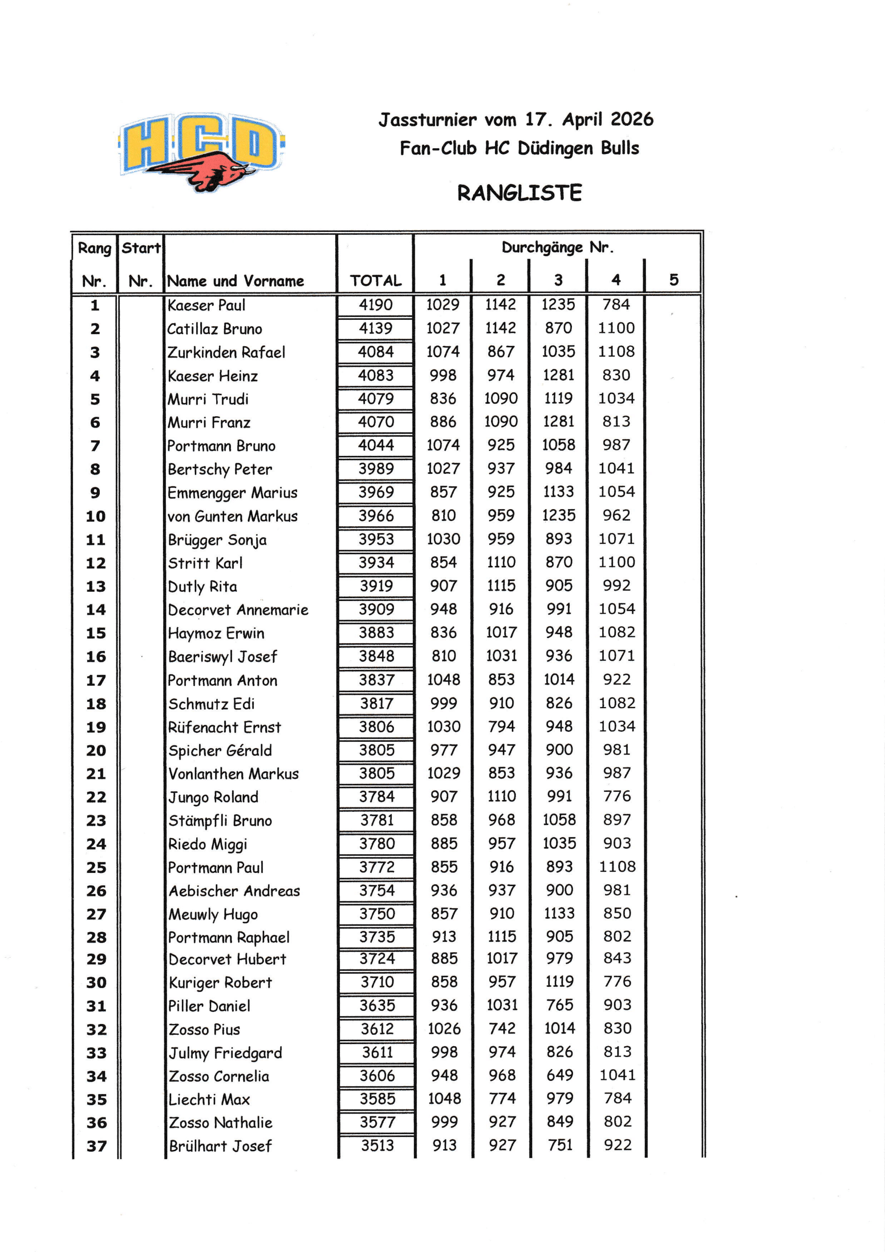 Am 17. April 2026 fand das traditionelle Jassturnier des Fan-Clubs der Düdingen Bulls statt. Zahlreiche Teilnehmer lieferten sich spannende Duelle und sorgten für einen geselligen Abend voller Spiel, Taktik und guter Stimmung.