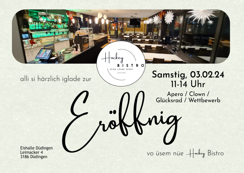 Werte Gäste der Eishalle Düdingen Wir laden alle gerne ein zur Eröffnung unseres neuen Hockey Bistro’s (Flyer anbei): Samstag, 03.02.2024 11.00-14.00 Uhr Apero / Clown / Glücksrad / Wettbewerb Die Hockey Bistro GmbH steht unter der Führung der Eishalle Düdingen und wird von Carmen Stadler und Cindy Loeffler geleitet werden. Meine Frau Andrea Clerc kümmert […]